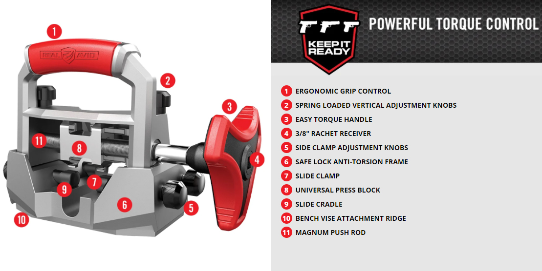 Description: Real Avid Master Sight Pusher. This heavy-duty and built to last master sight pusher is manufactured by Real Avid as a professional grade tool for quick installing and uninstalling of the pistol optic system. This tool protects both gun slides and the sights themselves and is designed to work on most modern pistol sights. This sight pusher showcases an oversized and comfortable easy torque handle, ergonomic control grip, a versatile slide cradle that accommodates all makes and models of striker-fire and 1911 pistols. This tool is perfect for changing out OEM sights and upgrading to after market options.