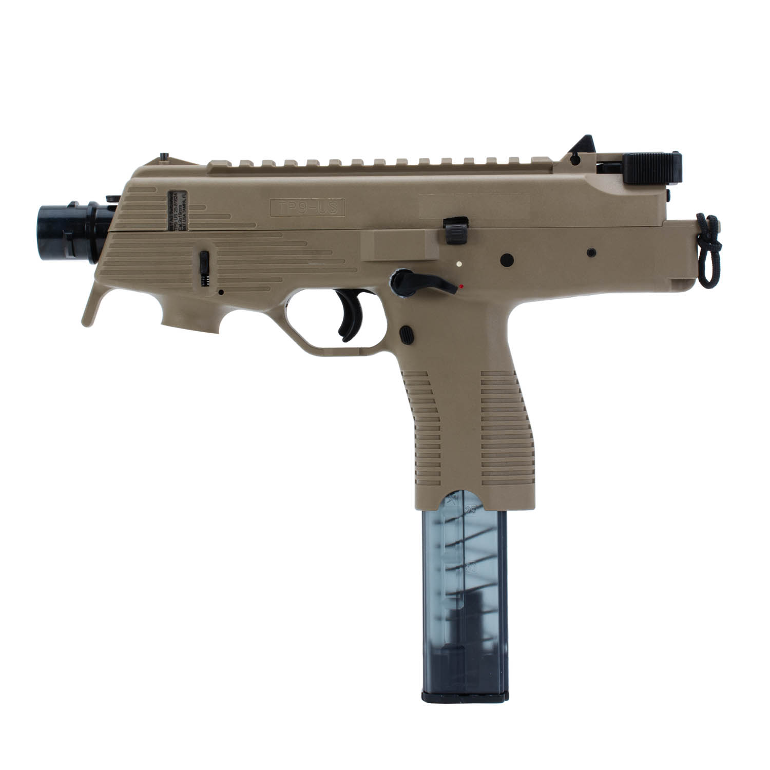 Description: B&T USA TP9-N 9mm Pistol, Coyote Tan. Manufactured with a sleek and powerful design, this TP9 series of blowback pistols from Brugger & Thomet (B&T) is chambered in 9mm and ships with a 30 round translucent magazine. The TP9 has a 5.1" barrel, 25mm Tri-Lug muzzle adapter, integrated iron sights with the top Picatinny rail and a right-side rail for accessories. The firearm features a rear-pull charging handle and a forward grip install point - utilized if the pistol is converted to an SBR. Easily install a folding pistol brace on the TP9 to enhance your control over the firearm. The TP9 is the perfect truck-gun or fun range-day firearm.