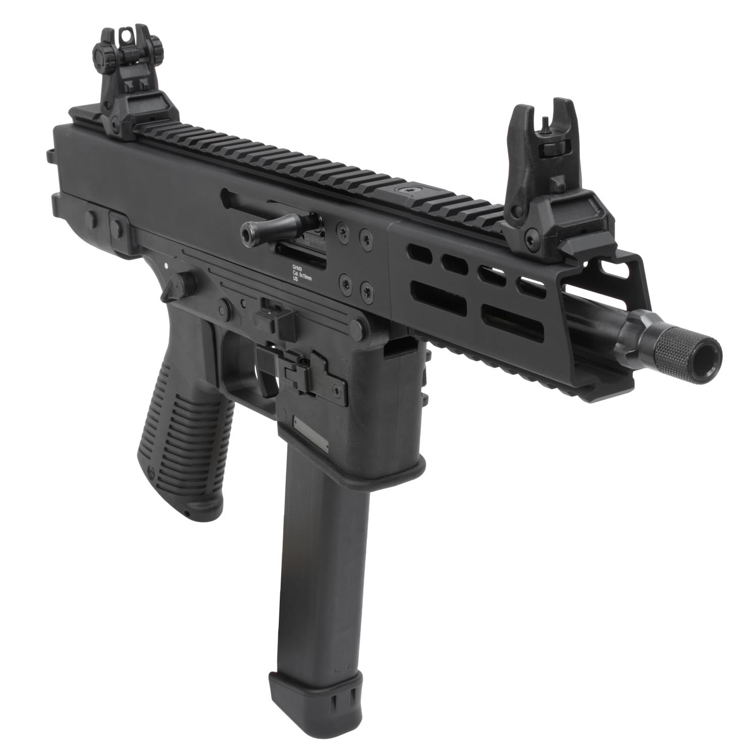 Description: B&T USA GHM9 9mm Pisol, Glock Magazine Compatible. Manufactured to be sleek, compact and powerful, this GHM series of blowback pistols from Brugger & Thomet (B&T) is chambered in 9mm and ships with a 30 round Glock mag. The GHM9 has a 6.9" barrel, Tri-Lug muzzle adapter, 1/2" x 28 TPI barrel threads and an overall slim tactical design. The firearm includes flip-up sights, a right-side charging handle, a full top Picatinny rail with one under the barrel, and M-LOK accessory slots on the left and right sides of the handguard. Easily install a folding pistol brace on the GHM to enhance your control over the firearm. The GHM9 is the perfect truck-gun or fun range-day firearm.