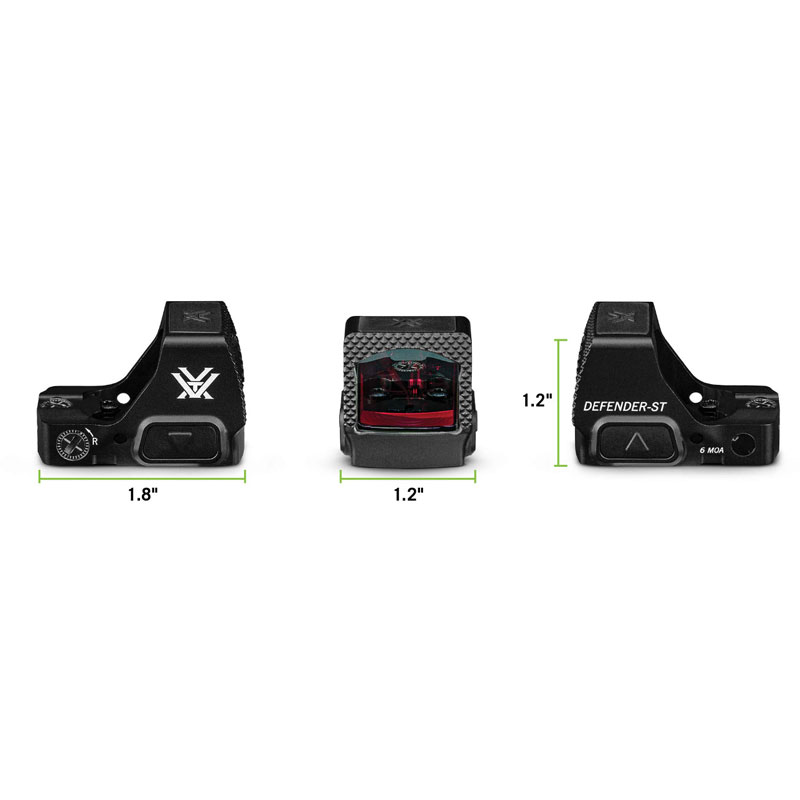 Description: Vortex Defender-ST 3 MOA Red Dot, Tan. From handguns to shotguns, the Defender-ST red dot is as versatile as your shooting interests. Whether this optic is part of your everyday carry setup or topping your favorite turkey gun, the large ultra-clear window is the perfect size for a smooth draw out of concealment and wide enough to quickly acquire the dot on that fast-moving tom.