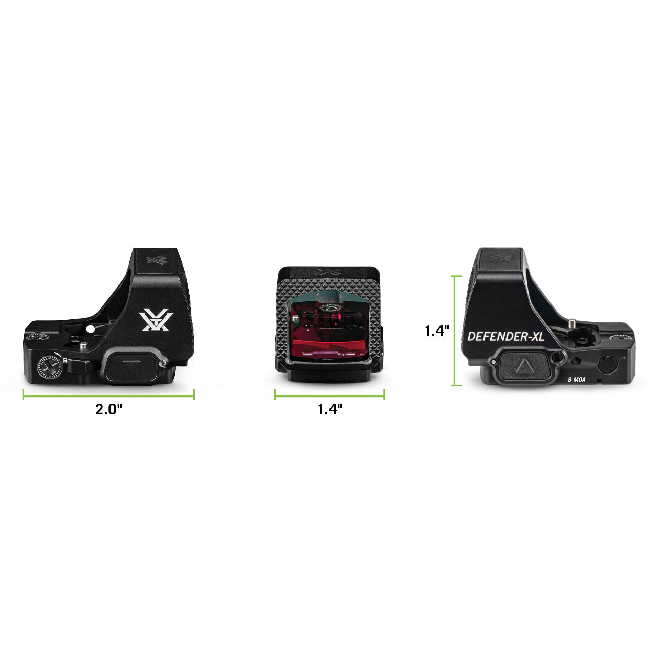 Description: Vortex Defender-XL 5 MOA Red Dot. Designed for toughness, speed, and accuracy, the Vortex Defender-XL 5 MOA Red Dot Sight withstands unexpected drops and the rigors of dynamic shooting. The ultra-wide sight window enhances field-of-view for quicker target acquisition, faster follow-up shots, and greater flexibility in unconventional shooting positions - all positioning you to dominate every round. Other red dots are made for competition. The Defender-XL is built to win. Target to target. Stage to stage.