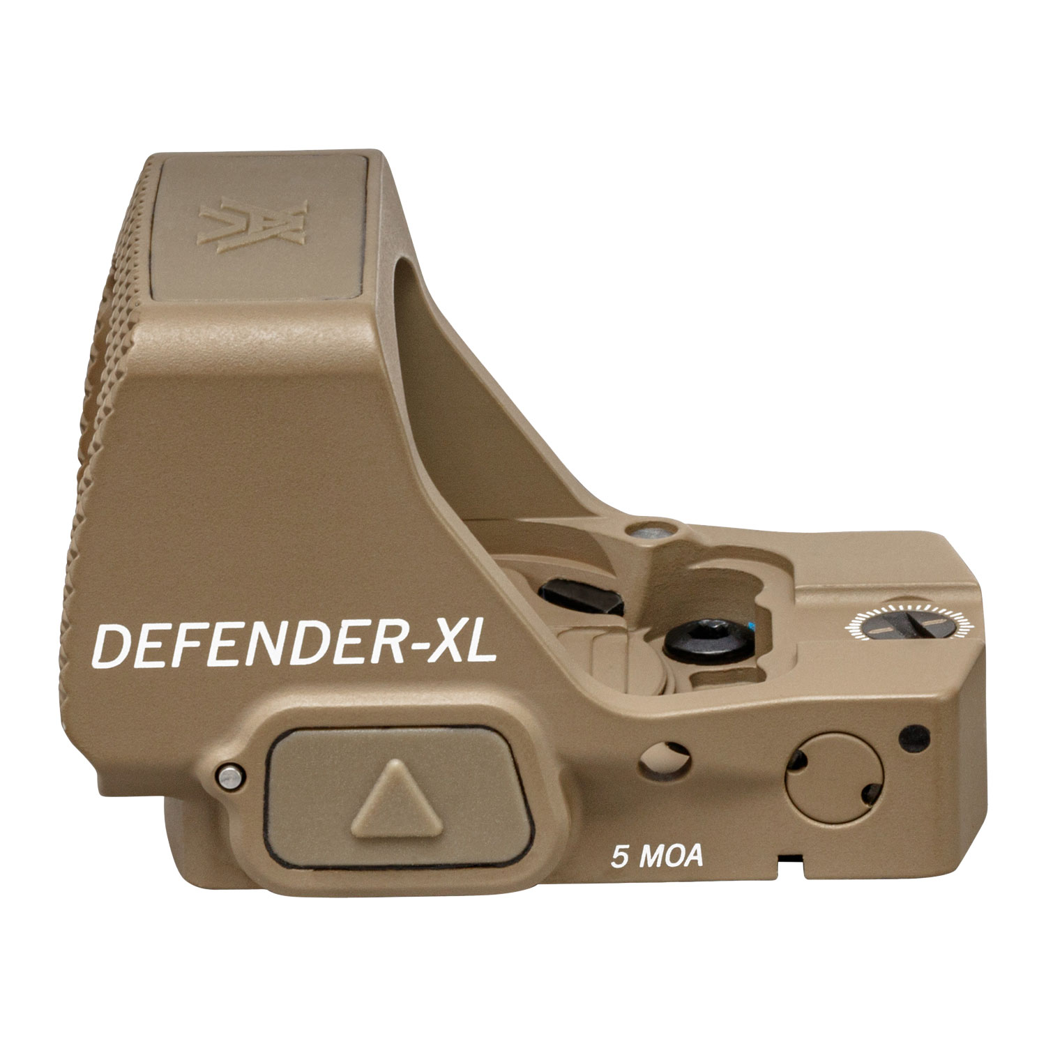 Description: Vortex Defender-XL 5 MOA Red Dot, Tan. Designed for toughness, speed, and accuracy, the Vortex Defender-XL 5 MOA Red Dot Sight withstands unexpected drops and the rigors of dynamic shooting. The ultra-wide sight window enhances field-of-view for quicker target acquisition, faster follow-up shots, and greater flexibility in unconventional shooting positions - all positioning you to dominate every round. Other red dots are made for competition. The Defender-XL is built to win. Target to target. Stage to stage.
