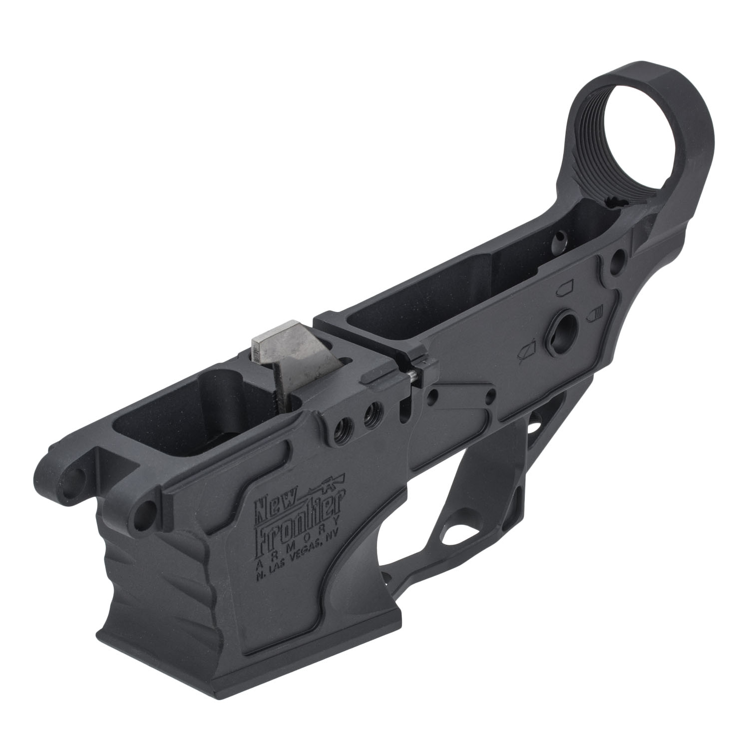 Description: New Frontier Armory AR-9 Stripped Billet Lower Gen2, Glock Style Magazines, Black. The G-9 Stripped AR-9 lower receiver from New Frontier Armory is manufactured from 7075-T6 aircraft-grade billet aluminum with a Mil-Spec matte black hard-coat anodized finish. The lower showcases a robust pistol caliber design for use in the AR-9 platform chambered for 9mm. The AR-9 stripped lower has an integrated trigger guard suitable for gloved operation and accepts Glock-style magazines. Contoured finger rests are incorporated into the design on either side of the magwell for enhanced ergonomics. Build a high-performance, reliable, AR-9 rifle or pistol with this high-quality stripped lower receiver from New Frontier Armory.