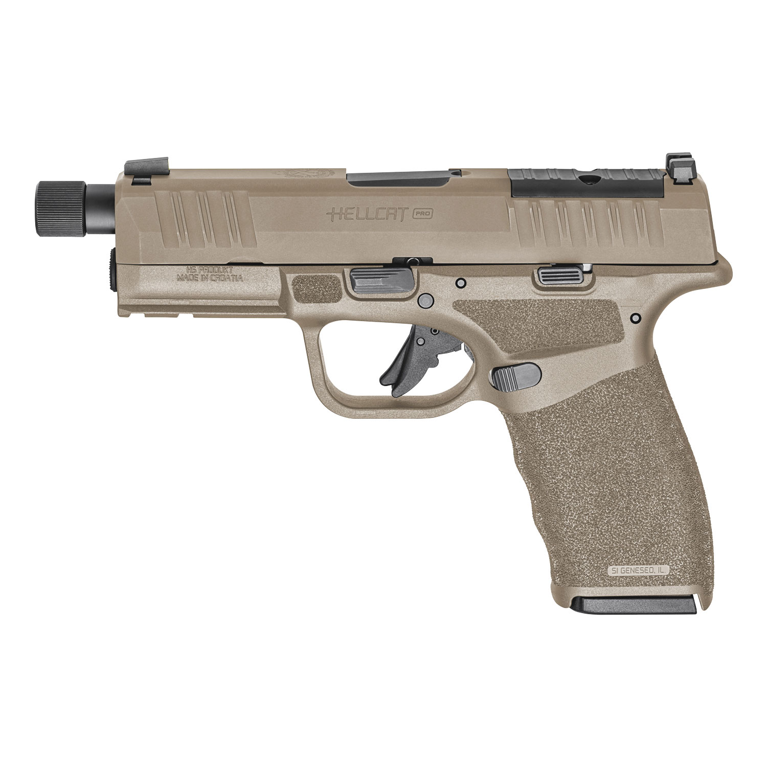Description: Springfield Hellcat PRO 4.4" Compact OSP Pistol w/ Threaded Barrel, FDE. Featuring an appealing combination of class-leading concealability, impressive capacity, and strong performance, the Desert FDE Hellcat Pro delivers the perfect balance. The pistol's 4.4" hammer-forged barrel features 1/2x28 muzzle threading, further enhancing the Hellcat Pro's capabilities. Optics-ready and equipped with a versatile accessory rail, this exceptional everyday carry pistol is finished in a durable Desert FDE Cerakote coating.