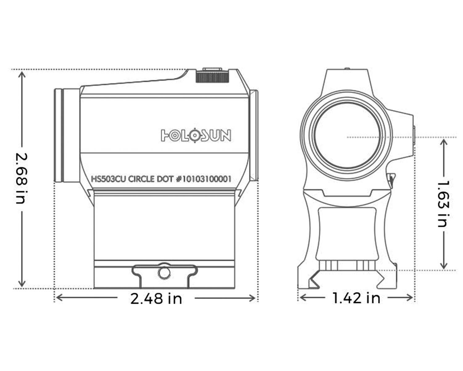 The HS503CU is a 20mm micro optical sight designed for rifle and carbine applications. Features include Solar Failsafe, Shake Awake, 12 brightness settings, Holosun's Super LED with up to 50k hours battery life, and Multi-Reticle System.