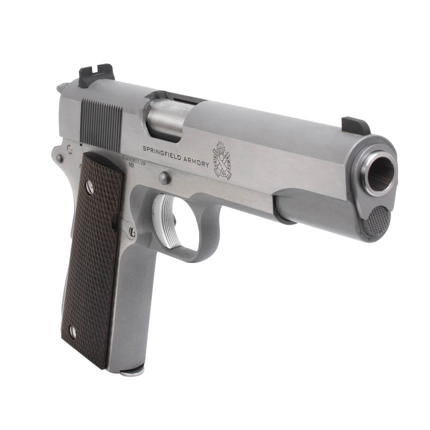 Description: Springfield Mil-Spec 1911 .45 ACP 5" Pistol, Stainless. This Springfield Armory Defend Your Legacy Series 1911 is a powerful .45 ACP carry gun that is reliable, sharp looking and will not break the bank. The 5" match-grade forged stainless barrel features a 1:16" twist rate and the durable stainless steel frame/slide keeps the firearm robust. This single-action only (SAO) 1911 pistol has a fixed combat three white dot installed onto the slide. This firearm includes a set of quality composite wood checkered grips and comes with a 7 round stainless steel magazine.