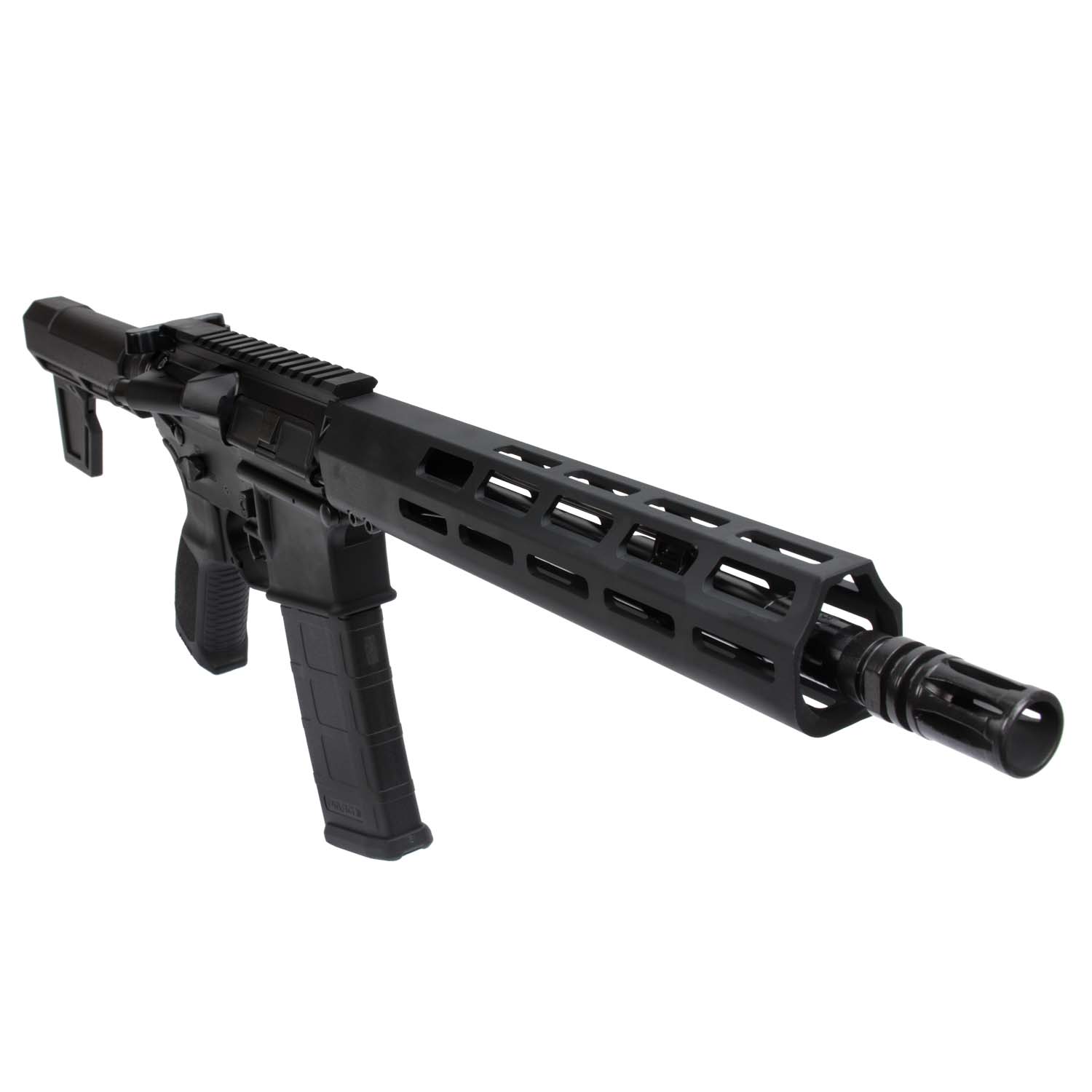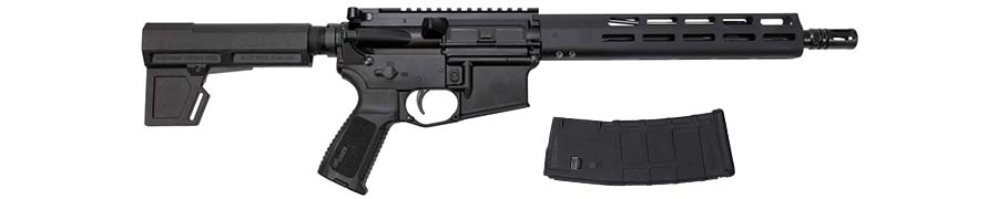 The M400 TREAD pistol is an aluminum receiver rifle caliber pistol. The TREAD pistol features an 11.5" Nitride Coated barrel with a free-floating M-LOK handguard, a single-stage polished/hard-coat trigger, ambidextrous controls, a Shockwave Blade multi position pistol brace, and is available in 5.56 NATO.