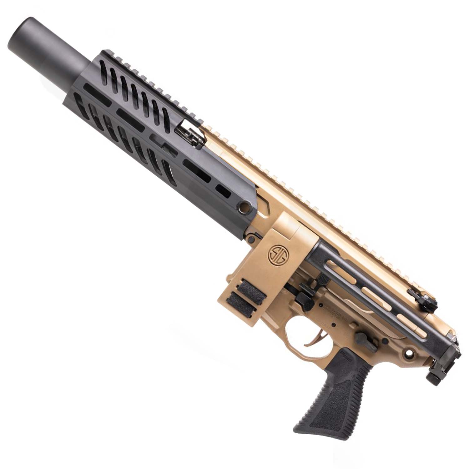 Description: Sig Sauer MCX Rattler Canebrake Pistol, 300 Blackout, 5.5" Barrel w/Inert Suppressor. Designed for those who want to run suppressed, the MCX Rattler Canebrake pistol from Sig Sauer offers .300 Blackout performance in a small versatile package. The pistol brace of this firearm folds to the side to reduce the length greatly all while boasting a free-floating M-LOK handguard over the 5.5" stainless steel barrel. This coyote brown firearm features an inert suppressor with the same dimensions / weight of a SIGSRD762 thus allowing the operator to train in the same manner while waiting on NFA approval. Ambidextrous selector switch, charging handle and mag release makes this pistol ideal for any type of shooter. The Rattler ships with a 30 round PMAG and boasts multiple sling attachment points on its quality crafted frame, truly making this firearm a must have for any situation.