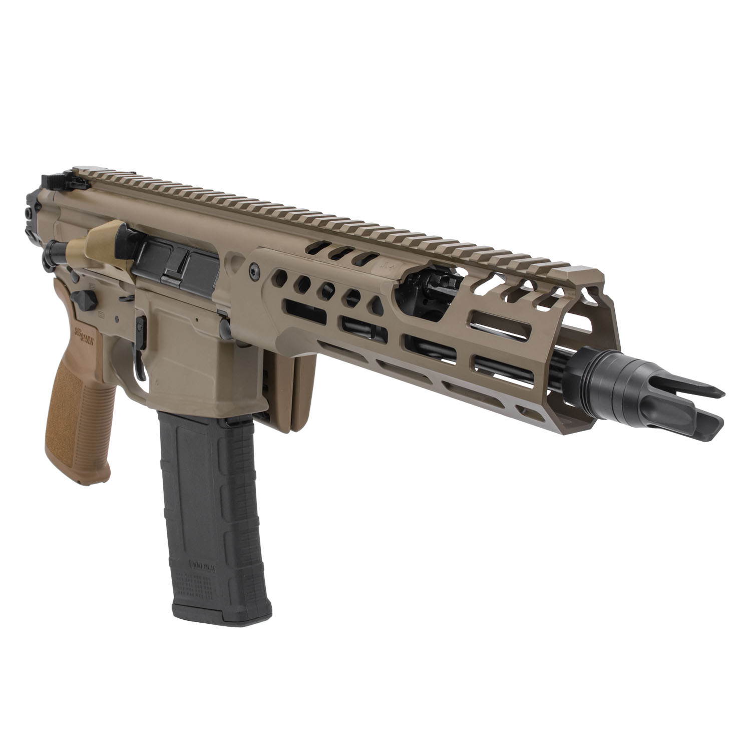 Description: Sig Sauer MCX Spear-LT Pistol, 300 Blackout 9" Barrel, w/ IR Coating. Developed utilizing the best features of the original MCX and the Virtus, the LT is the perfect blend of high-quality function and concealability. Chambered in .300 Blackout, this small, yet versatile, package delivers performance when needed most. The pistol boasts a free-floating M-LOK handguard over the 9" cold hammer forged carbon steel barrel that features a SIG QD suppressor-ready flash-hider installed to the 5/8" x 24 TPI threads. The receiver carries a Gen II NiR FDE Cerakote finish as well as other parts in FDE such as the grip, brace and handguard. A Sig foldable pistol brace is also included. The ambidextrous charging handle, selector switch, mag release and even bolt release make this pistol ideal for any type of shooter. The pistol also accepts interchangeable barrels - now compatible with all LT barrels and handguards. The MCX Spear-LT ships with a 30 round AR-15-style magazine and includes multiple sling attachment points on its quality-constructed frame; truly making this firearm a must-have for any situation.
