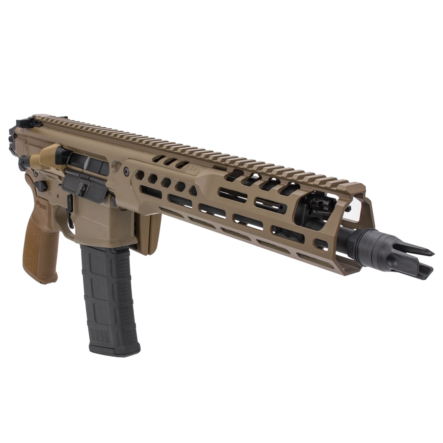 Description: Sig Sauer MCX Spear-LT Pistol, 5.56 NATO 11" Barrel, w/ FDE IR Coating. Developed utilizing the best features of the original MCX and the Virtus, the LT is the perfect blend of high-quality function and concealability. Chambered in 5.56 NATO, this small, yet versatile, package delivers performance when needed most. The pistol boasts a free-floating M-LOK handguard over the 11.5" cold hammer forged carbon steel barrel that features a SIG QD suppressor-ready flash-hider installed to the 1/2" x 28 TPI threads. The receiver carries a Gen II NiR FDE Cerakote finish as well as other parts in FDE such as the grip, brace and handguard. A Sig foldable pistol brace is also included. The ambidextrous charging handle, selector switch, mag release and even bolt release make this pistol ideal for any type of shooter. The pistol also accepts interchangeable barrels - now compatible with all LT barrels and handguards. The MCX Spear-LT ships with a 30 round AR-15-style magazine and includes multiple sling attachment points on its quality-constructed frame; truly making this firearm a must-have for any situation.