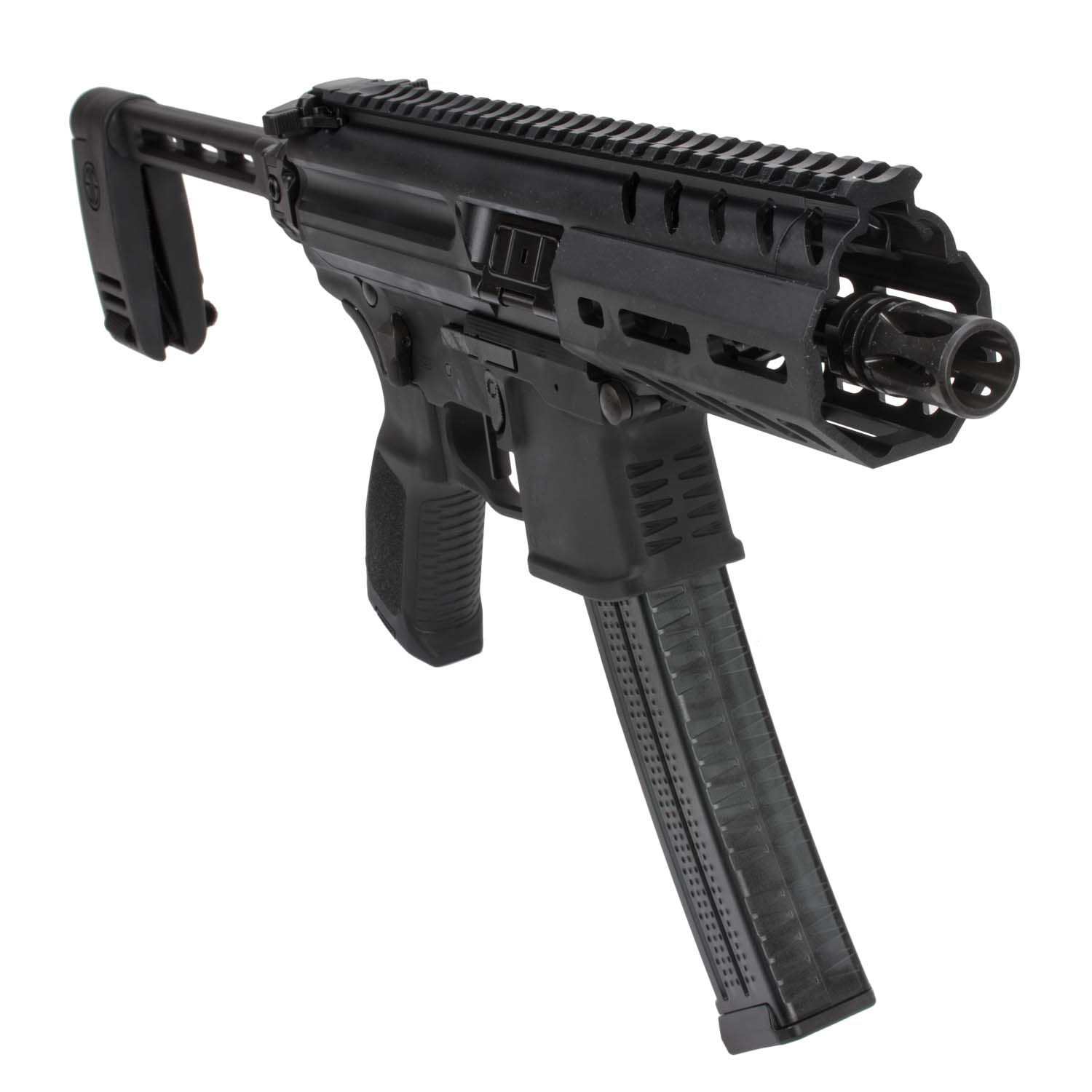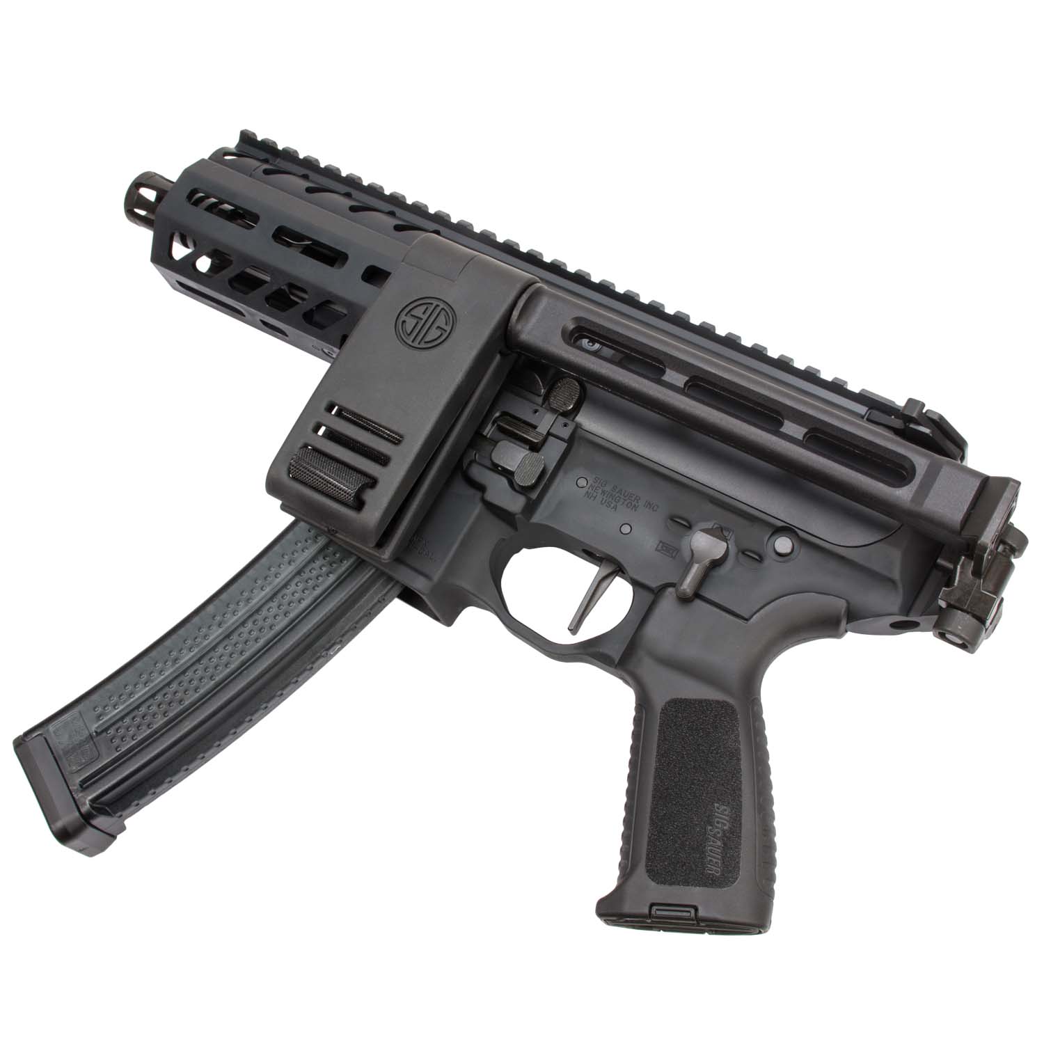 Description: Sig Sauer MPX K Pistol 4.5", 9mm, Pistol Brace, M-LOK Handguard & 30 Round Mag, Black. Constructed with a black anodized aluminum alloy frame and a carbon steel 4.5" barrel, the MPX K from Sig Sauer is a versatile, reliable & compact pistol chambered in 9mm. Shipping with a Sig foldable pistol stabilizing brace, an A2-style flash hider, free-floating M-LOK handguard, and a 30 round capacity magazine, the MPX K is built for reliability and concealability while offering the same great quality you would expect from any other Sig product. With a barrel twist rate of 1:10 and a single stage Timney performance trigger, this pistol sends precise and smooth shots on target. Great for left or right handed operation, the MPX K can be outfitted with many accessories to tailor to the shooter's comfort needs.