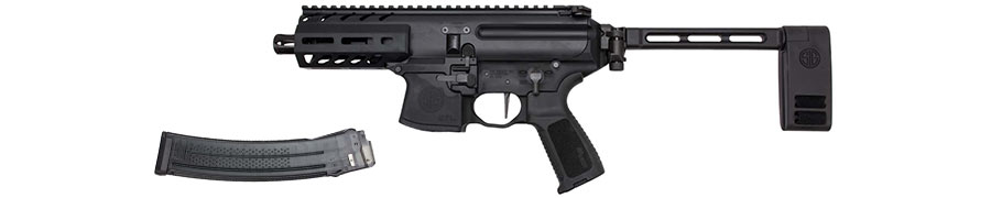 Made of durable aluminum and rubber, this pistol includes a SIG Pistol Stabilization Brace that folds to the left of the firearm. The brace allows for greater control of the firearm when shooting, especially one-handed shooting.