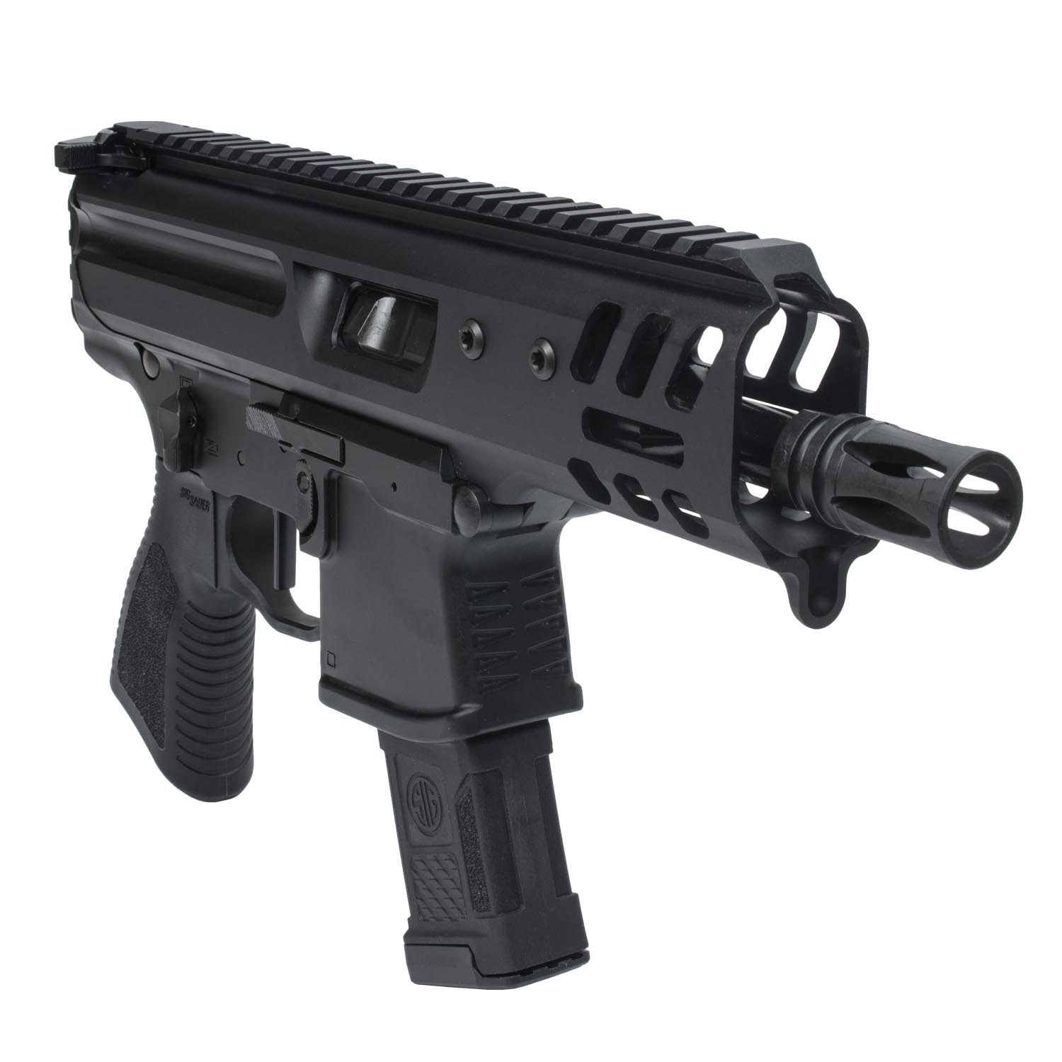 Description: Sig Sauer MPX Copperhead Pistol 4.5", 9mm, 20 Round Mag, Black. Re-designed for the ideal blend of power, function and concealability, the MPX Copperhead pistol from Sig Sauer offers tactical 9mm performance in a small versatile package. The pistol boasts an aluminum alloy receiver housing a 4.5" carbon steel barrel with a flash hider installed and a Timney single stage straight trigger. Ambidextrous selector switch, charging handle, bolt release and mag release makes this pistol ideal for any type of shooter. The MPX Copperhead forend has a 1913 rail on top with M-LOK accessory mounts near the muzzle and ships with a 20 round MPX mag. This Sig firearm is a must have for any situation.