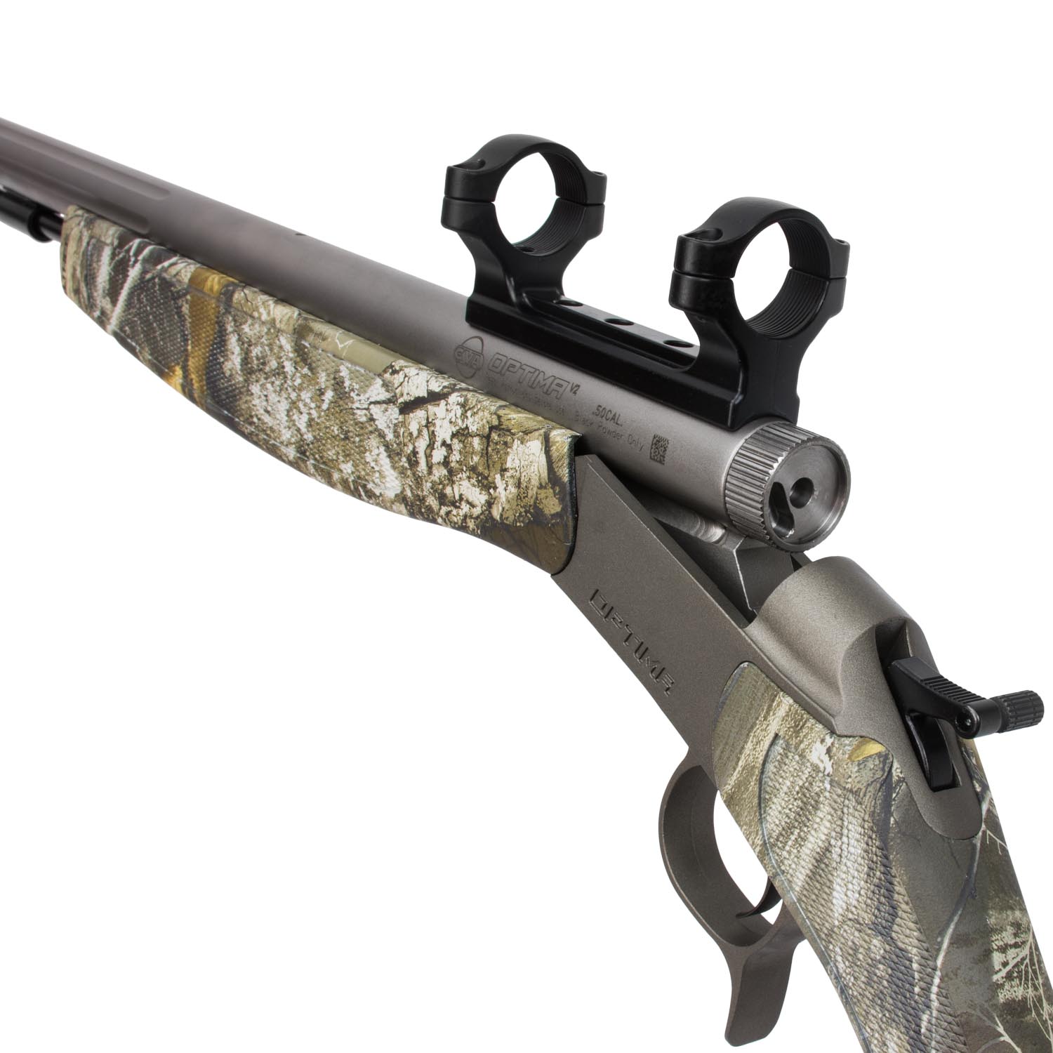 Description: CVA Optima V2 Muzzleloader, Stainless/Realtree Edge, .50cal. Designed with many new features over its predecessor, the Optima V2 muzzleloader rifle from CVA is chambered in .50 cal and boasts the Realtree EDGE camo pattern on its ambidextrous stock. The stainless steel fluted barrel of this black powder rifle measures 26" and has a DuraSight DEAD-ON scope mount installed. CVA's Quick Release Breech Plug (QRBP) is used on this rifle to allow the shooter to easily remove it without tools; the included ramrod also comes with a PalmSaver end for more comfortable reloading. A great choice for a traditional hunting experience or just having some black powder fun, the Optima V2 from CVA gives you all the modern features in a classic muzzleloading platform.