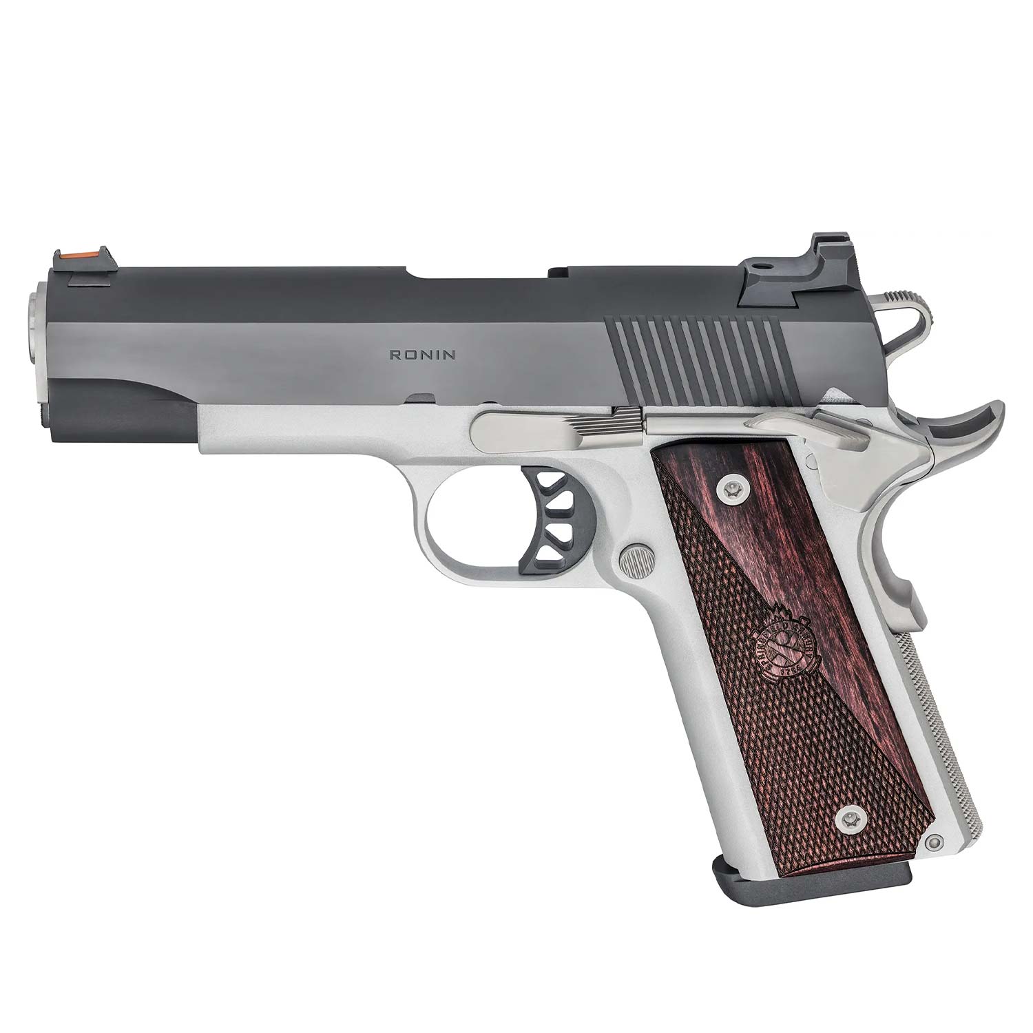 Description: Springfield 1911 Ronin 9mm 4.25" Pistol. The Ronin 1911 from Springfield Armory is the ultimate 9mm 1911-style carry gun that is both sharp looking and reliable. The smaller 4.25" match-grade forged stainless barrel features a 1:16" twist rate and the pistol's lightweight satin aluminum alloy frame keeps the firearm strong. This single-action only (SAO) 1911 pistol boasts a red fiber optic sight paired with a tactical white dot rear installed onto the matte blued slide. This firearm includes a set of high-quality hybrid checkered/smooth wood grips and comes with a 9 round stainless steel magazine.