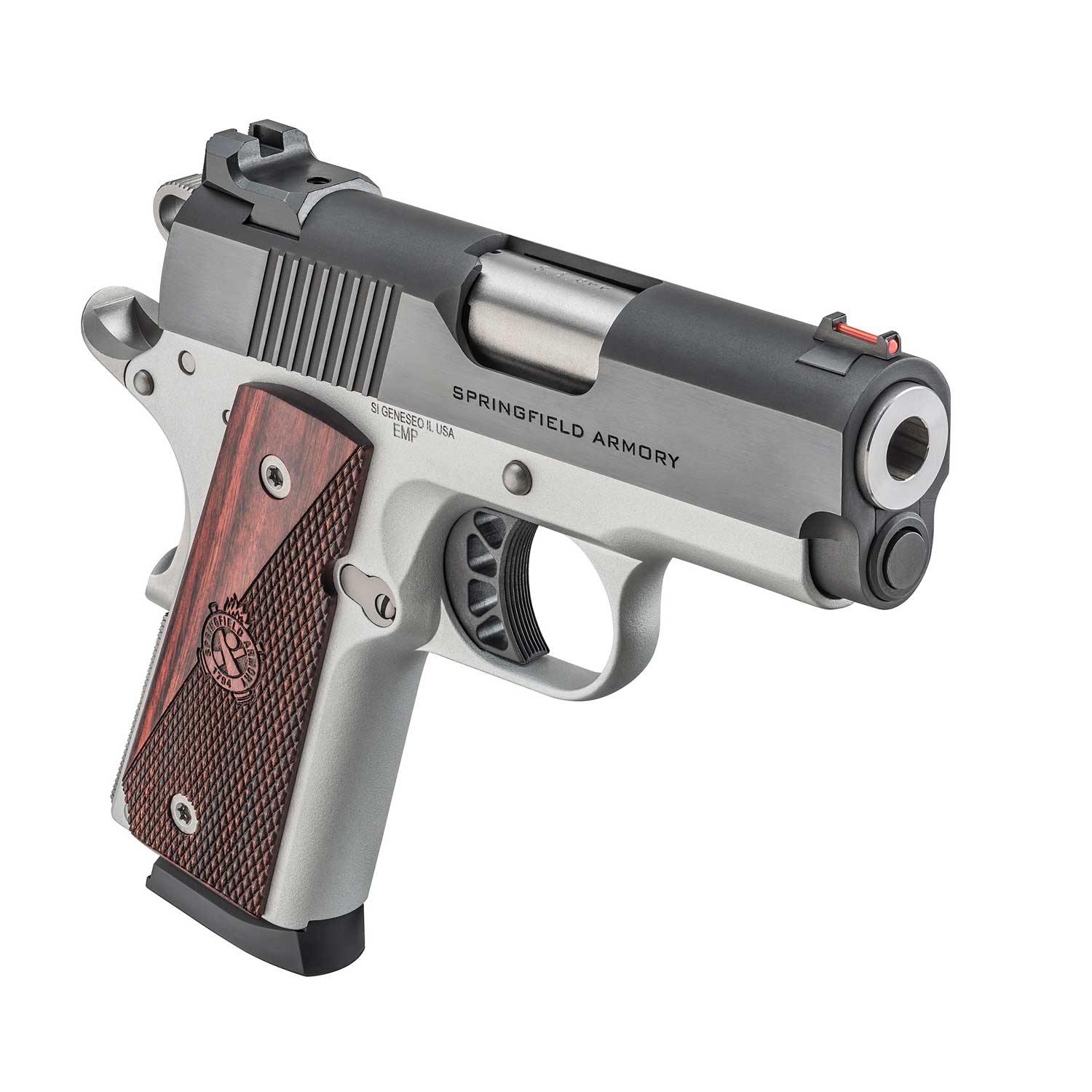 Description: Springfield 1911 Ronin EMP 9mm 3" Pistol. Focused on concealment, the Ronin EMP from Springfield Armory is the ultimate 9mm 1911-style carry gun that is both reliable and sharp looking. The 3" match-grade forged stainless barrel features a 1:16" twist rate and the lightweight satin aluminum alloy frame keeps the firearm strong. This single-action only (SAO) 1911 pistol has a red fiber optic sight paired with a tactical white dot rear installed onto the matte blued slide. This firearm includes a set of high-quality hybrid checkered/smooth wood grips and comes with a 9 round stainless steel magazine.