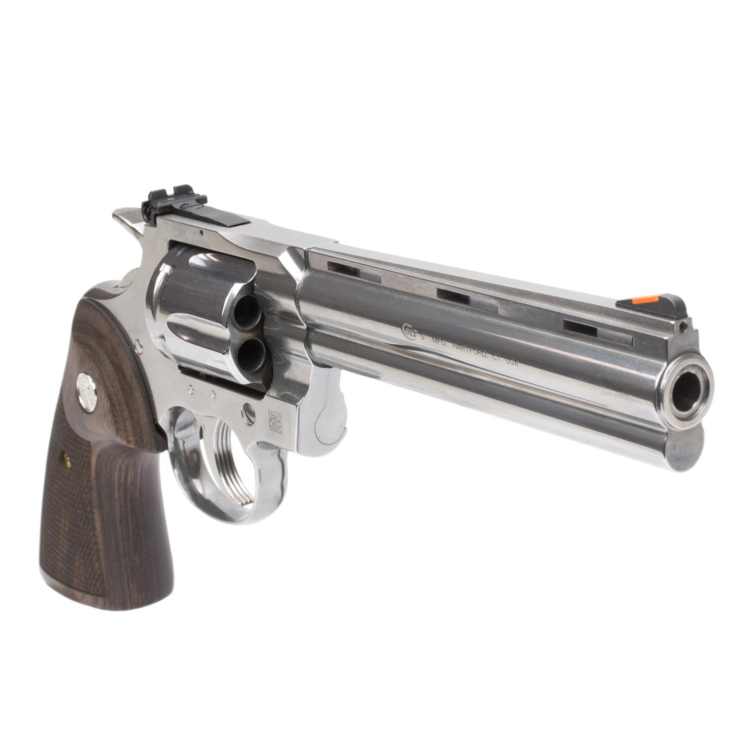 Description: Colt Python .357 Magnum Revolver, Stainless w/ Walnut Grip, 6" Barrel. Making a comeback with modern design updates, the Python revolver from Colt features a 6 inch barrel chambered for .357 Magnum / .38 Special. This double action 6-shot revolver has a stainless steel frame / cylinder with walnut grips that feature iconic Colt medallions. The rear sight of this Python is adjustable for both windage and elevation and is installed on a newly reinforced frame that provides stronger shooting performance and reliability. Grab this eye-catching revolver today to expand any firearm collection.