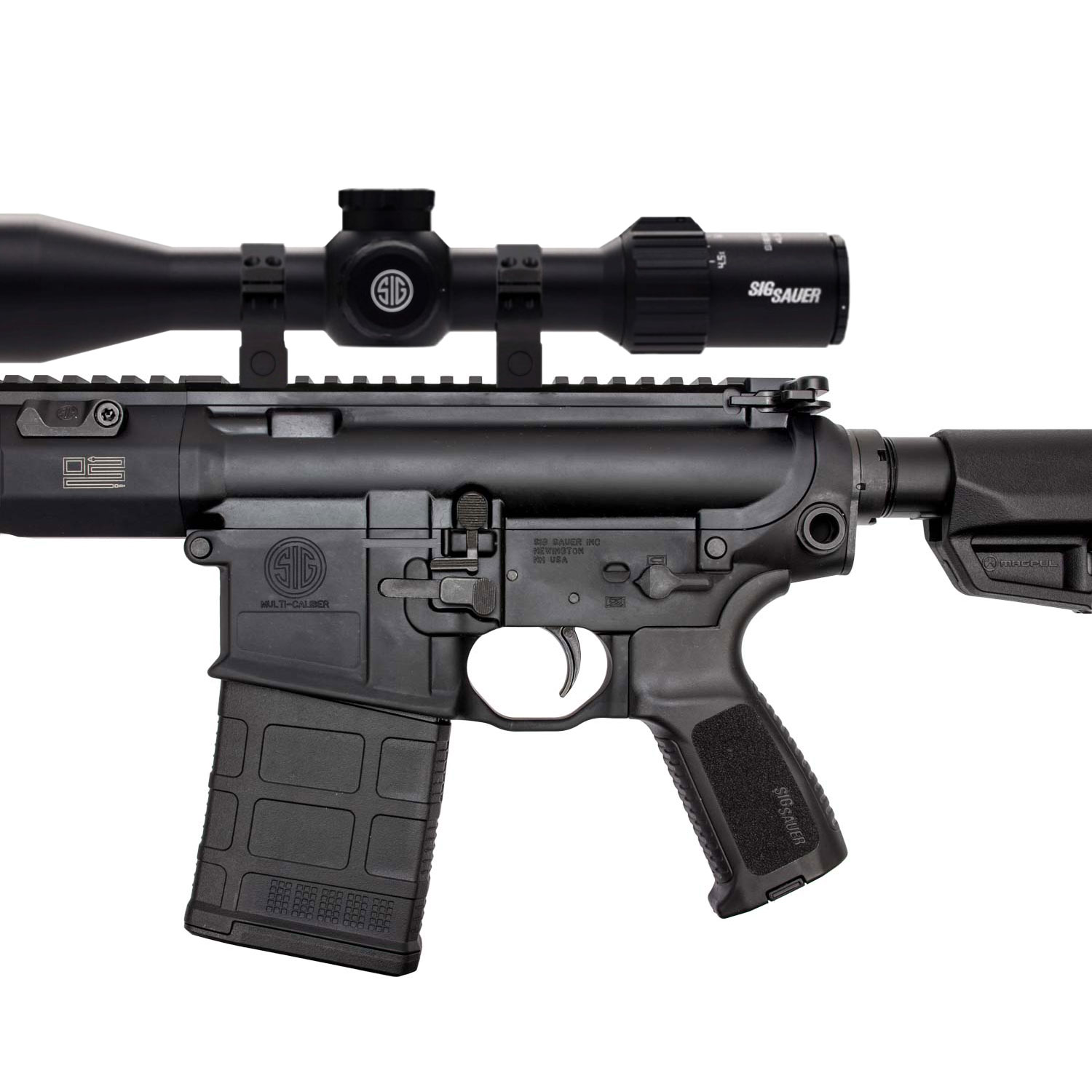 Description: Sig Sauer 716i Tread Rifle/Scope Package, 308 Win. 16" Barrel, 4.5-14x44mm Sierra 3 BDX Scope. Constructed with a black anodized aluminum alloy frame and a carbon steel nitride 16" barrel, the 716 TREAD package from Sig Sauer comes with the Sig Sierra 3 BDX 4.5-14x44mm riflescope. The rifle is a versatile, reliable & cost-effective 7.62x51mm chambered AR-10 rifle for novice and experienced shooters alike. Shipping with a 6 position SL-K stock, 3 prong flash hider, free-floating M-LOK handguard, and a 20 round capacity PMAG, the TREAD is built for reliability and offers the same great quality as you would expect from any other Sig product. With a barrel twist rate of 1:10 and a two stage Matchlite Duo trigger, this rifle gives power and accurate shots on target. Great for left or right handed operation, the TREAD can be outfitted with many accessories to tailor to the shooter's comfort needs.