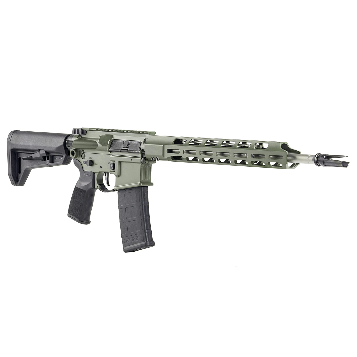 Description: Sig Sauer M400 Tread V2 Rifle, 5.56mm 16" Barrel, Moss. Designed with enhanced features over the original M400 Tread, Version 2 M400 from Sig Sauer boasts a 16" stainless steel barrel, a Moss Green Cerakote finish, a redesigned Tread Enhanced M-LOK handguard and is chambered for 5.56x45mm / .223 Rem. The barrel is cut with 1/2" x 28 TPI threads with a 3-prong flash hider installed. The M400 V2 offers an ambidextrous mag catch, safety and charging handle. A SIG flat blade 2-Stage Matchlite Duo trigger is installed as well as a Magpul SL-K 6 position stock. The M400 is built to be a sharply upgraded rifle right out of the box; no need to worry about those small post-purchase upgrade projects. As with all Sig rifles, this model is built to perform and is ideal to customize to your comfort, shooting and situational needs.