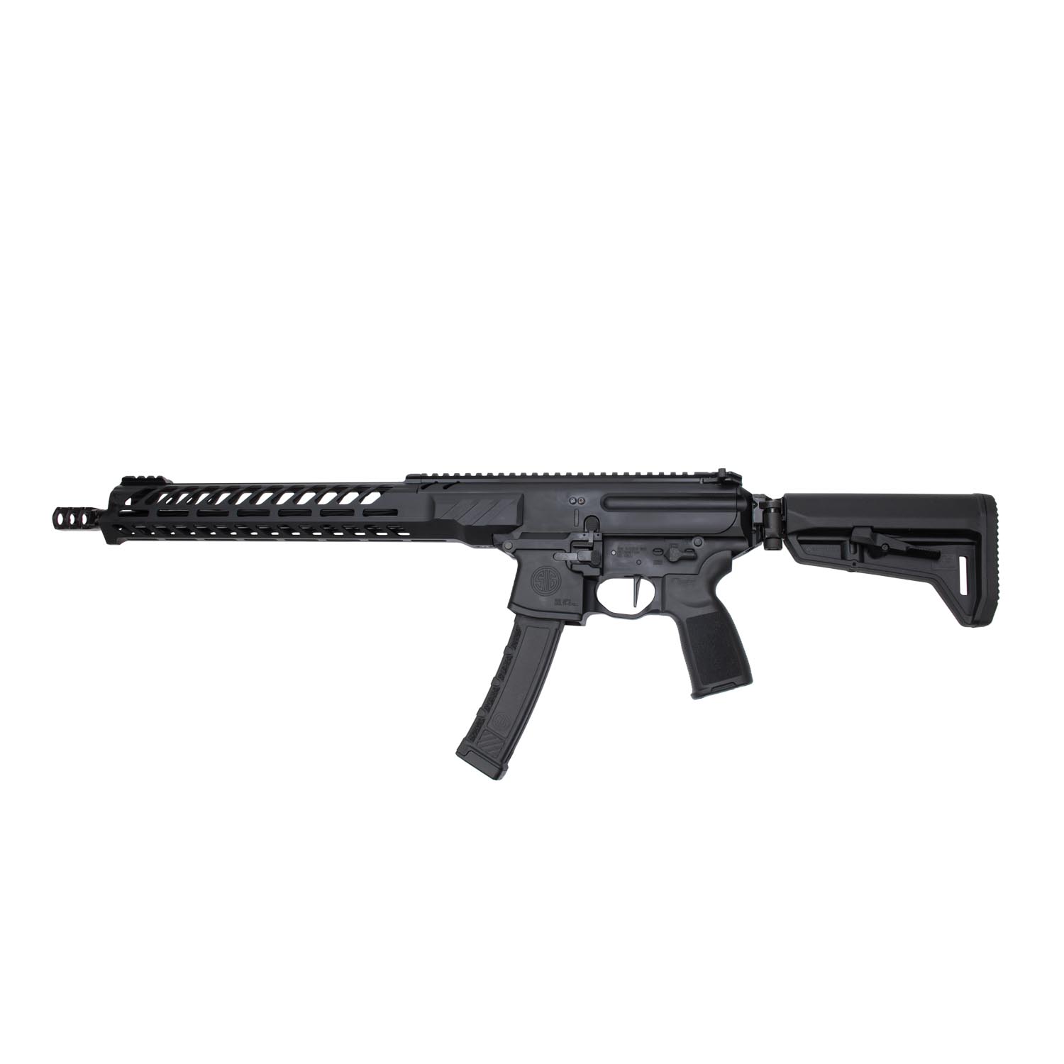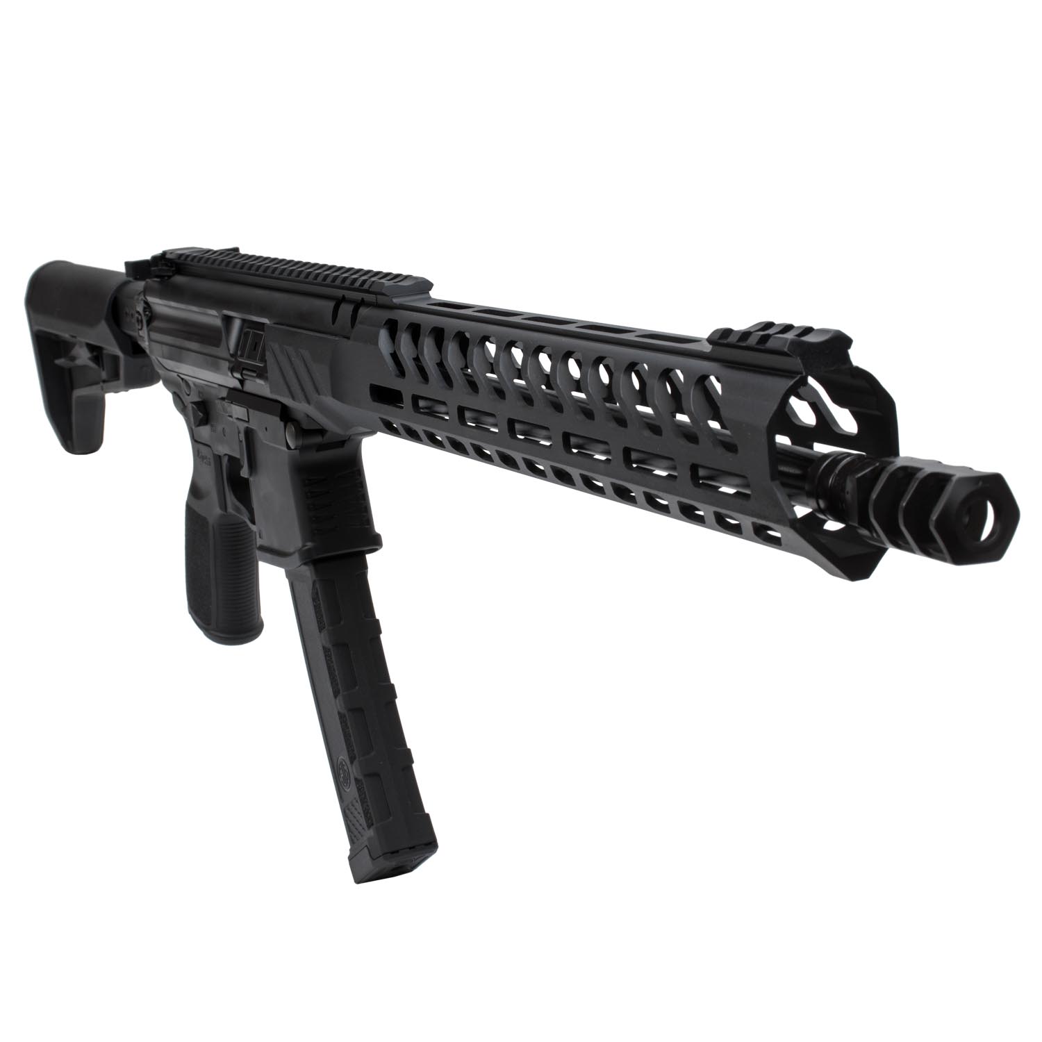 Description: Sig Sauer MPX PCC Rifle, 9mm 16" Barrel & 35 Round Mag, Black. Designed to be an out-of-the-box competition ready carbine, the MPX PCC blends performance, reliability and comfort into one package. Sig and Timney Triggers teamed up to develop the perfect straight single stage trigger to compliment this carbine. This MPX rifle from Sig Sauer is chambered in 9mm and boasts a full 16" carbon steel barrel with M13.5 x 1 threading and ships with a 3 chamber compensator for reducing muzzle jump / recoil. The stock of this firearm telescopes to 5 positions and folds to the side. The PCC has a slim free-floating M-LOK handguard to give more of an M4 feeling to the shooter. Ambidextrous selector switch, charging handle, bolt release and mag release makes this rifle ideal for any type of shooter. The MPX PCC ships with a 35 round MPX mag and boasts multiple sling attachment points on its quality crafted frame, truly making this firearm a must have for competition shooters.