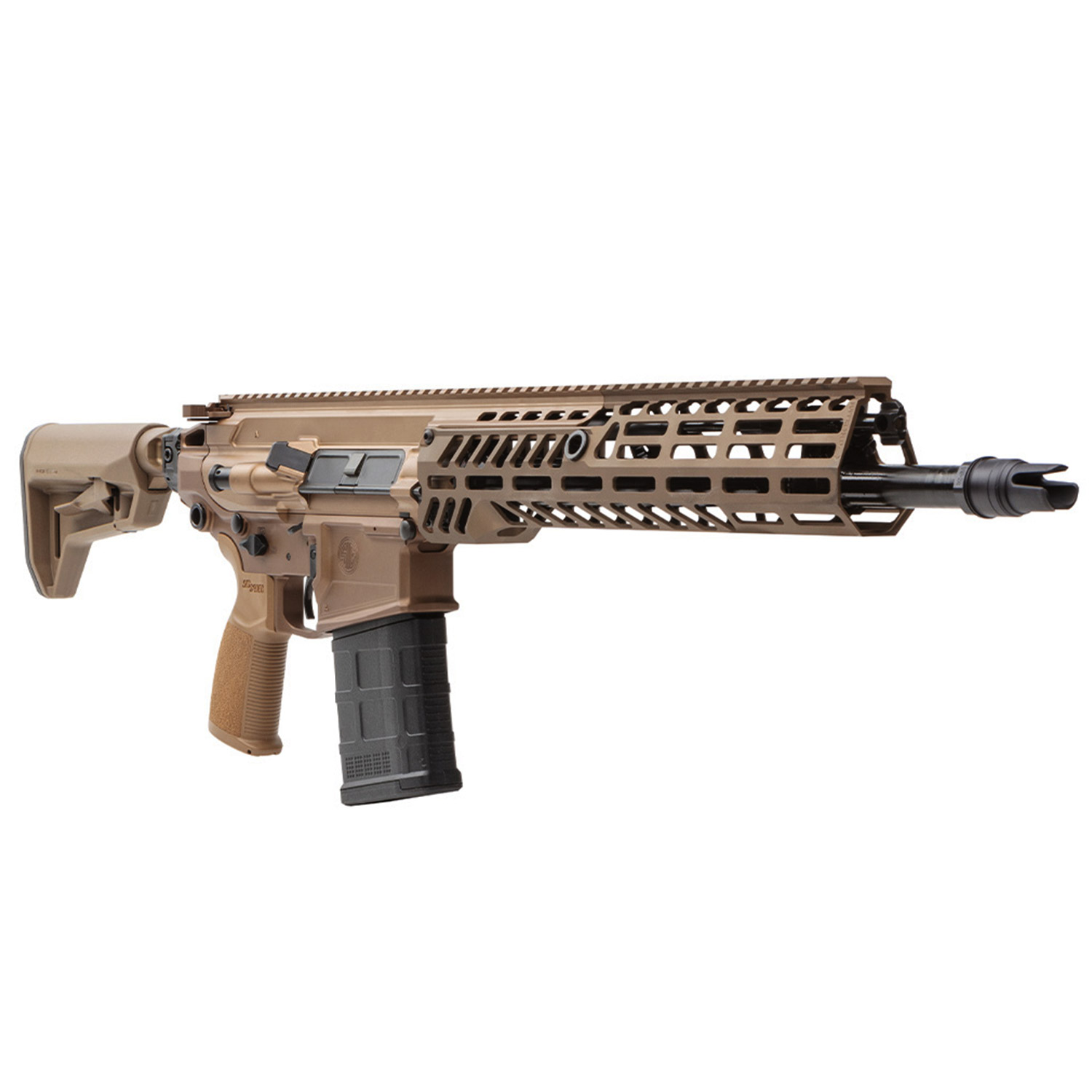 Description: Sig Sauer MCX SPEAR Rifle, 7.62x51 NATO 16" Barrel, 20 Round Magazine. Developed with the best features of the original MCX and as the civilian model of the Army's new XM7 rifle, this MCX Spear from Sig Sauer boasts a 16" barrel, a coyote anodized finish, a rugged handguard/receiver design and is chambered for 7.62x51. The barrel has a 5/8" x 24 TPI thread cut with a QD suppressor-ready flash hider installed. The reinforced free-floating M-LOK handguard surrounds the chrome/molly steel interchangeable barrel and the two-position adjustable gas valve. A curved Matchlite Duo match-grade trigger is installed, rifle controls are fully ambidextrous and the firearm boasts a six position adjustable/foldable Magpul SL-M stock. The MCX Spear is built for reliability and offers the same outstanding quality you would expect from any other Sig platform. Outfit this rifle with all the accessories you want to tailor it to your specific comfort, shooting and situational needs.