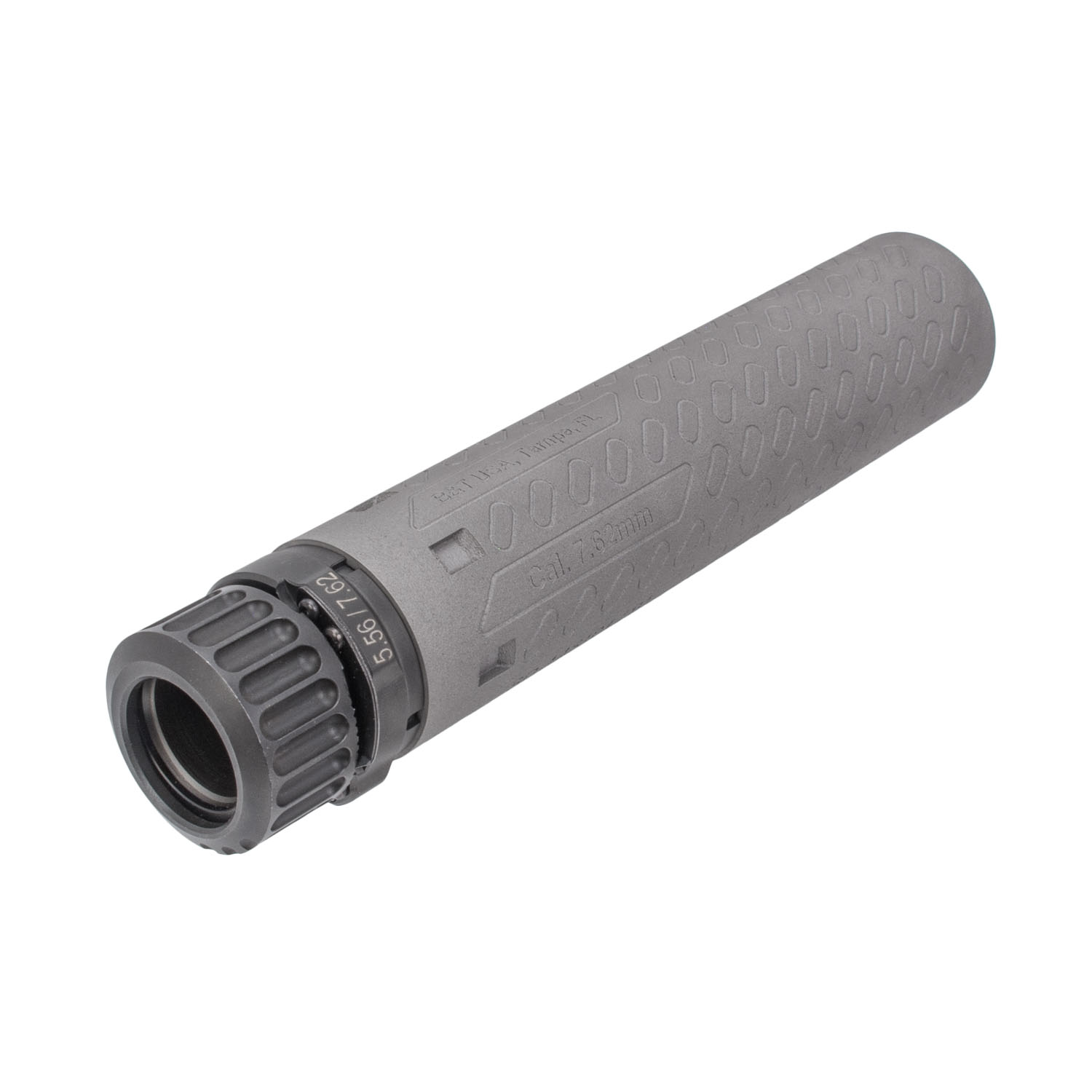 Description: B&T USA Rotex 762 Compact Suppressor w/ Surefire Hub Adapter. This Rotex series 762 suppressor from B&T is a 7.62 NATO can designed from printed 718 Inconel alloy with features that make it suitable for your modern sporting rifle setup. The Rotex 762 Compact has an overall length of about 8 inches and fits rifles chambered for 7.62x51mm, .308 Win and other .30 caliber offerings, even magnum loads. This suppressor includes the B&T Rotex-SF HUB to fast attach to B&T Rotex flash hiders as well as other muzzle devices from Surefire. With a diameter of 1.56" and a weight of 18.5 oz., this weldless suppressor gives your loadout the performance to achieve the best results when shooting at range or out in the field.