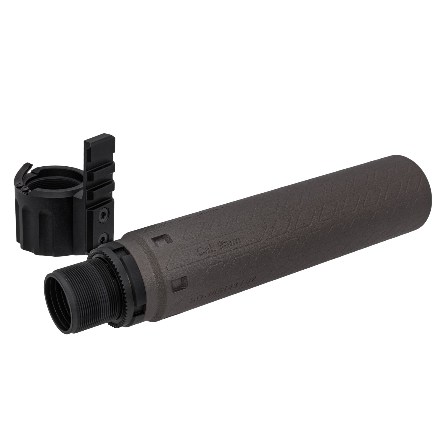 Leveraging B&T's proprietary RBS technology, the Print-X TP9/MP9 Ti Suppressor significantly minimizes gas blowback-keeping your sight picture clear and your submachine gun running smoother. This optimized gas management improves on the renowned high level of flash and sound reduction as the legacy model, while delivering a more comfortable shooting experience.
