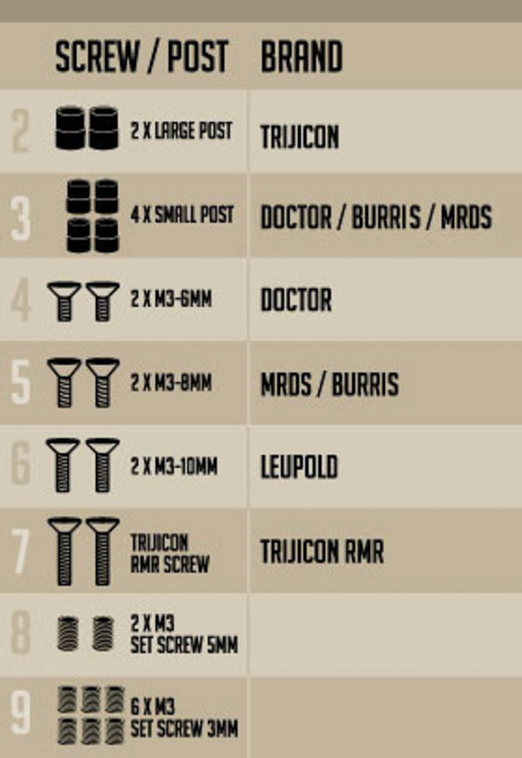 Strike Industries is proud to introduce a revolutionary new product The Universal (Optics) Mount for Glock. It has the lowest height-over-bore mount in the industry without the hassle of cutting your slide or cost of buying an aftermarket slide! We have put many hours and 1000's of rounds down range with most of the more popular red dot optics on the market with no problems whatsoever! This includes the Burris* Fast* Fire* II & III, Leupold* Delta Point* reflex sights, Docters* II & III, EoTech* MRDS*, Trijicon* RMR,* Vortex Venom and Viper, and many others. The mount itself is secured to the slide via the dove tail with 6 set screws. Two in the dovetail cut and one forward and aft of the dovetail and two more to prevent any shift. This provides a steady, sturdy and rugged mount that will repeatedly hold zero. Other mounting hardware included is 6mm, 8mm and 10mm screws (two of each) that are used to fit and secure most of the popular optics out there. (Depending on what optic you have you will need to find the screws that correlates with your particular optic. There are two special screws for Trijicon RMR. Once you secured the GUM to your slide and found the correct post (two sets of reinforcing post included) for your optic, go ahead and mount your optic on the post and use the final two longer securing screws to secure your optic to the GUM.