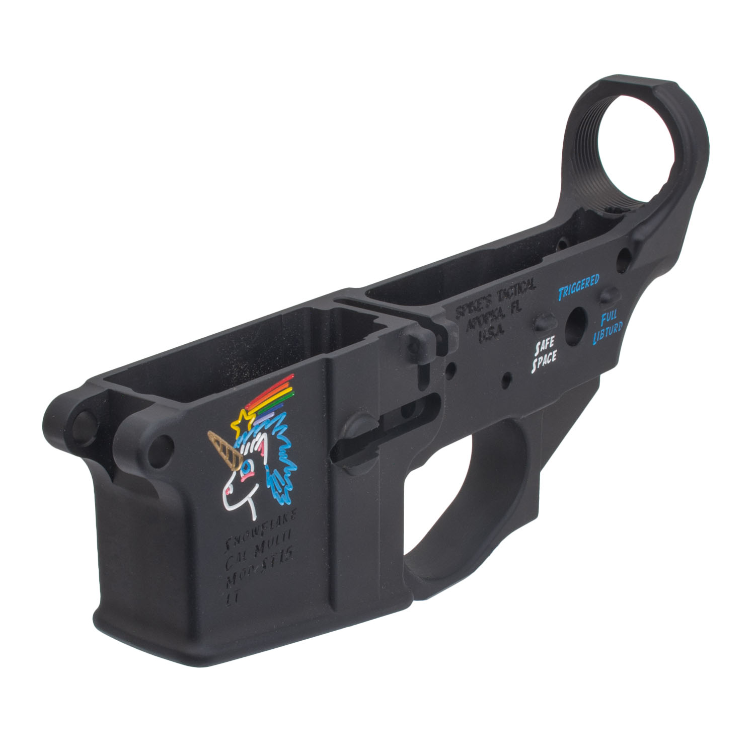 Description: Spike's Tactical AR-15 Stripped Lower Snowflake, Color-Filled Markings. This quality crafted AR-15 stripped lower receiver from Spike's Tactical is manufactured for AR platform rifles/pistols chambered for standard calibers such as .223 Rem, 5.56x45mm and .300 Blackout. The Snowflake receiver is machined from 7075-T6 aluminum and boasts hand-colored markings that pop as clear as MSM lies. Along with the vibrant unicorn featured at the front, the selector text reads "Safe Space", "Triggered", and of course, "Full Libturd". Hard coat anodized black, this AR lower weighs 8.6 ounces and is fully compatible with Mil-Spec internal parts and aftermarket/Mil-Spec upper receivers. The receiver has a low-shelf design which is perfect for RDIAS builds - if you want to full-libturd, you go and full-libturd. Ideal for your next workshop project and getting head-turns at the range, the Snowflake lower from Spike's Tactical is a great addition to any operator's loadout!
