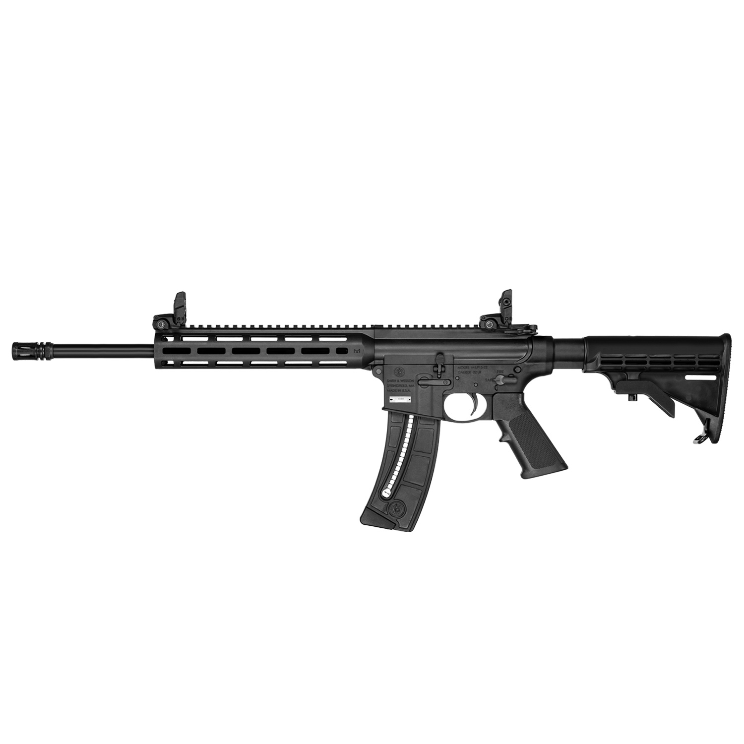 Description: Smith & Wesson M&P15-22 Sport Rifle, .22LR, 16.5", 25 Round Magazine. Great for plinking and practicing for tactical scenarios, the M&P15-22 Sport from Smith and Wesson is an AR platform firearm chambered in .22 LR. This rifle boasts a 16.5" carbon steel barrel and fires via blowback operation. The M&P15-22 is lightweight - only 5 pounds, but comes with all of the standard AR features like a collapsible stock, M-LOK accessory slim 10" handguard, flip-up Magpul MBUS sights, functioning charging handle, A2 flash hider and more. Upgrade your plinking arsenal with this quality-made S&W rimfire AR-15 rifle.
