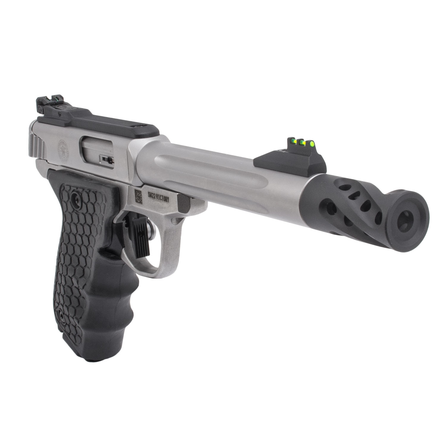 Description: Smith & Wesson Performance Center SW22 Victory Target .22LR Pistol, 6" Fluted Target Barrel. Accurate, reliable and an iconic design; the SW22 Victory rimfire pistol from Smith and Wesson is a great addition to any avid plinker's arsenal. Chambered in .22 LR and built with a 6" stainless steel fluted barrel boasting 1/2" x 28 TPI barrel threads and a custom muzzle brake installed, this Performance Center Victory has a 10+1 capacity and ships with two single-stacked mags. The pistol has a Tandemkross hiveGrip installed to ensure positive control and features both a left-side manual thumb safety and an extended magazine release. The firearm has a green fiber optic front sight and an adjustable rear sight installed and ships with a Picatinny rail segment that can be swapped for the rear. Whether you are in search of a new competition rimfire pistol or just enjoy plinking with the cheap .22 LR caliber, the Smith & Wesson SW22 Victory is the handgun for you.