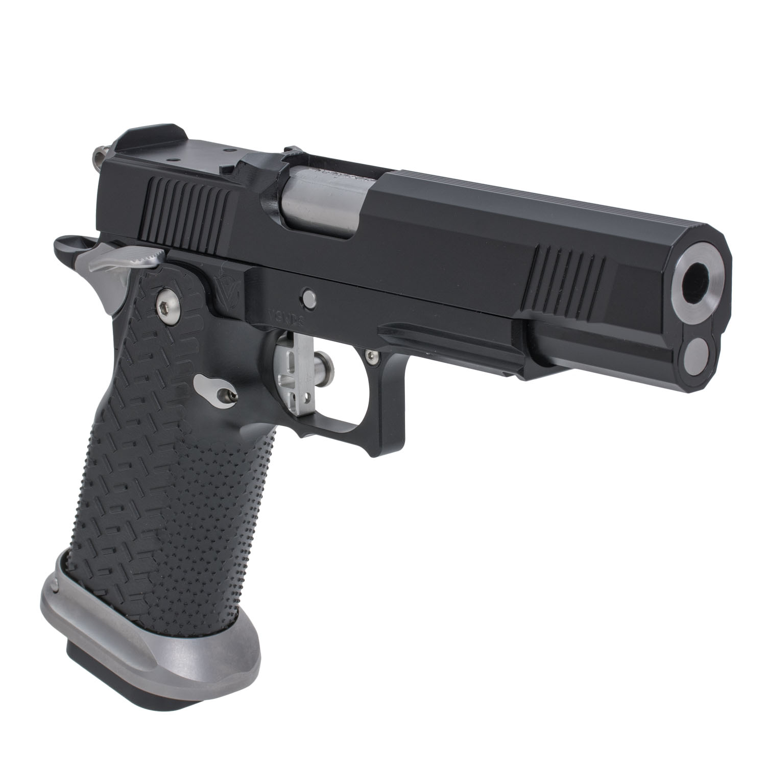 The grip style on this pistol is the hybrid aluminum offered by Vudoo and features the Vudoo tactical magwell installed.