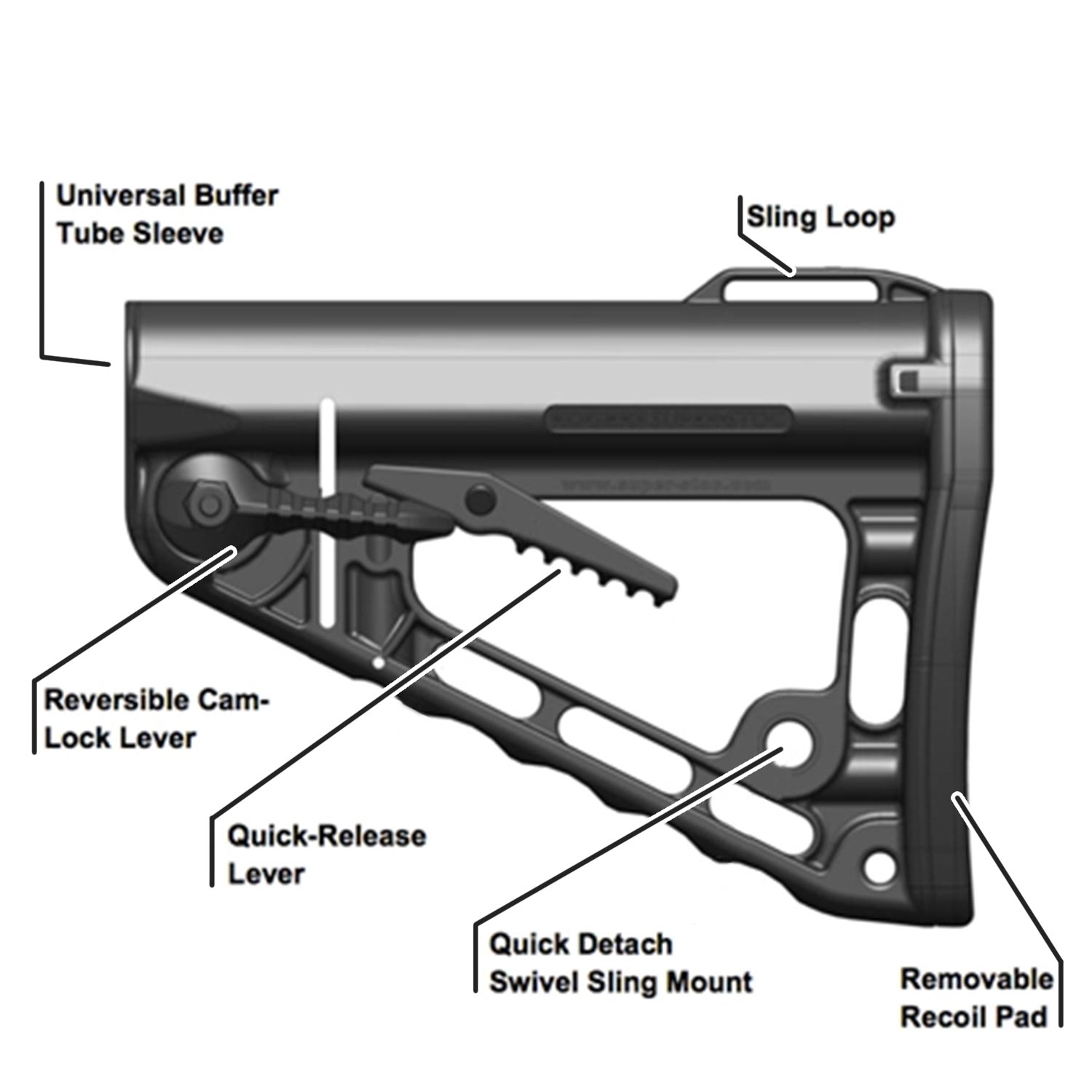 - Innovative Cam-Lock System completely removes any slop or play inherent with collapsible stocks.