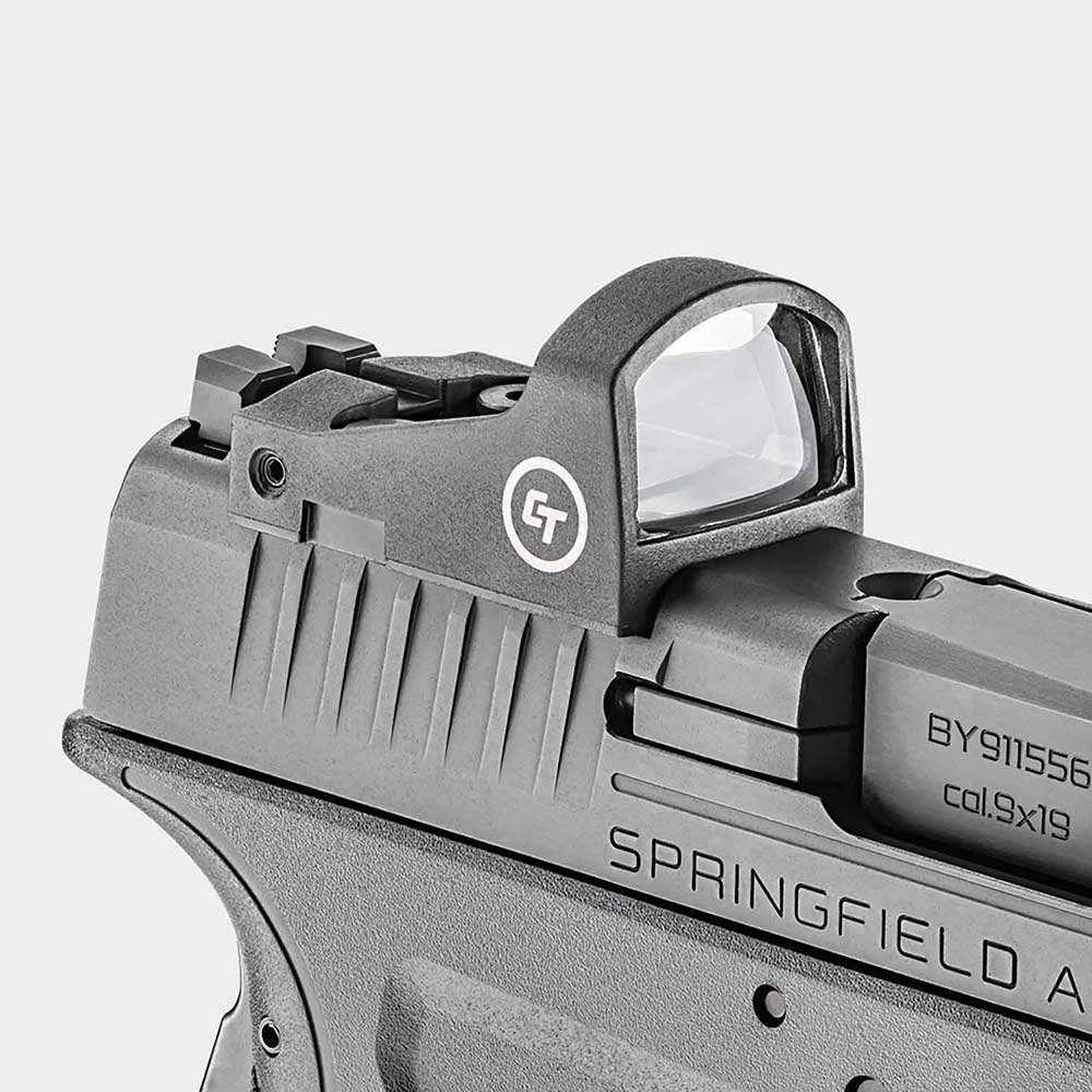 Description: Springfield XD-S MOD.2 3.3" Single Stack OSP Pistol w/ Crimson Trace Red Dot. Designed for EDC (Every Day Carry), this pistol is less than 1" wide and packs a lot of features in a compact frame. The Springfield XD-S Mod.2 OSP pistol comes with a factory installed Crimson Trace CTS-1500 red dot, iron sights, hammer forged slide, hammer forged 3.3" barrel, ambidextrous magazine release, standard accessory rail, loaded chamber indicator, OSP cover plate and Springfield's MOD.2 grip texture. The pistol also comes with a 7-round magazine with pinky extension and an extended 9-round magazine with grip extension for increased capacity.